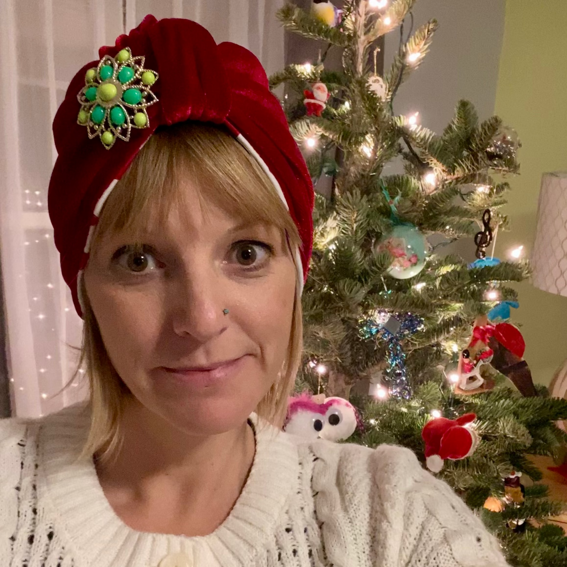 This turban is a beautiful red velvet on one side, and can be reversed to a solid white on the other.